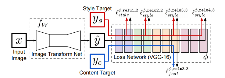 该模型分为两个部分,一个风格图像生成网络(Image Transform Net),和一个用于计算损失的网络(VGG-16)。