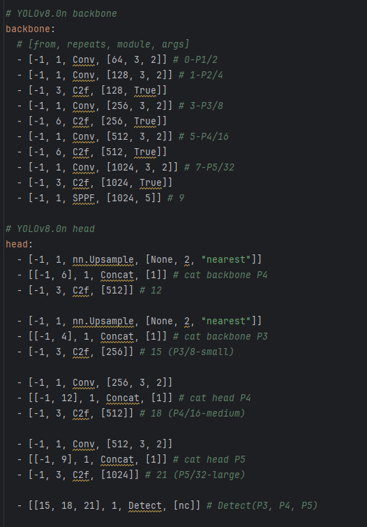 - [[15, 18, 21], 1, Detect, [nc]] # Detect(P3, P4, P5)最上面的nc是类别数目,会根据数据集改变,不需要专门更改