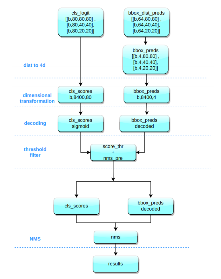 YOLOv8在推理过程中与YOLOv5几乎一模一样,唯一的区别在于对Distribution Focal Loss中的积分表示bbox形式进行解码,转换成常规的4维bbox形式,接下来的计算过程与YOLOv5相似。以COCO的80类为例,假设输入图片尺寸为640x640,在MMYOLO实现中的推理过程如下所示: