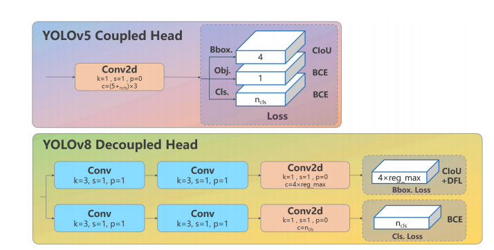 3. 解耦头的设计:YOLOv8的Head部分从原先的耦合头变成了解耦头结构,将分类和检测头分离,并且从Anchor-Based转变为Anchor-Free,简化了模型结构并提高了推理速度。