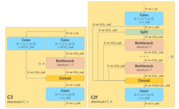 下面的图是YOLO模型原先使用的C3结构和新的C2f的结构。