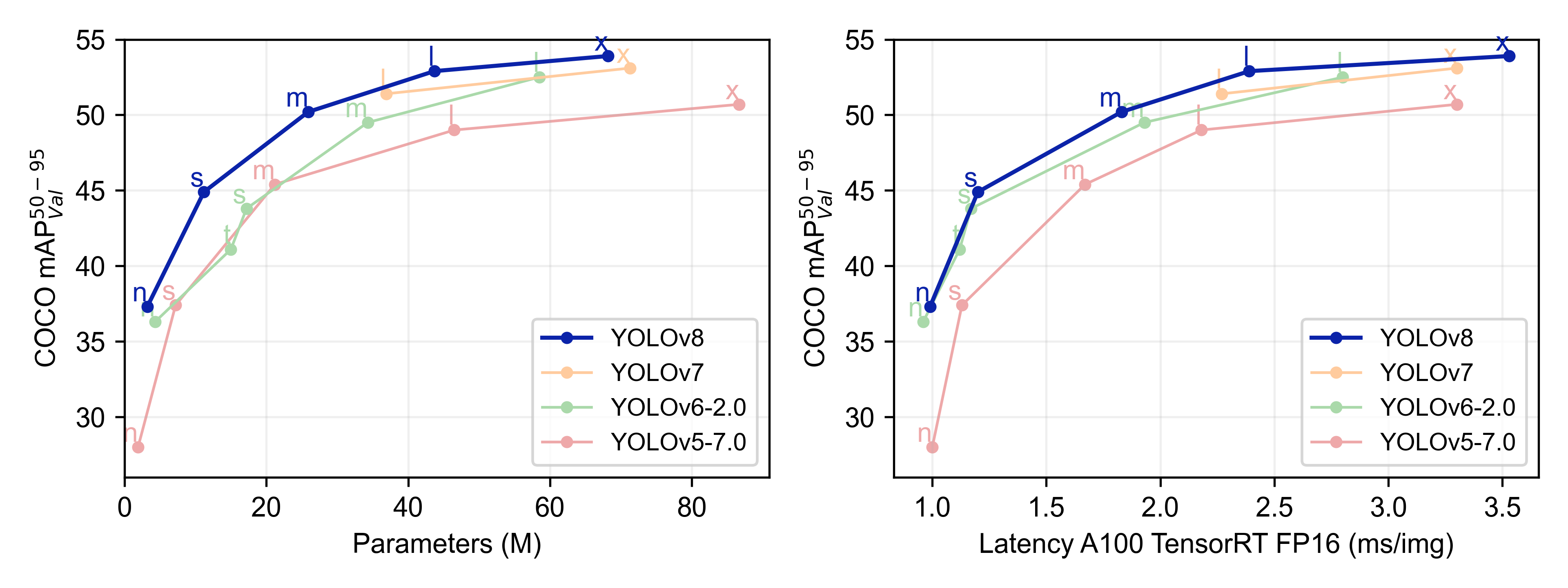 首先来看一下YOLOv8算法的性能.根据官方提供的性能图,其中左图的横坐标表示的是网络的参数量,右图的横坐标表示的网络在A100显卡上的推理速度,纵坐标方面表示表示的都是模型的精度。可以看到,YOLOv8模型的在同样的参数量下,比其他系列的YOLO模型有明显的精度提升,在右图展示的同样的map精度下,YOLOv8的模型也同样有更快的速度,还就那个更高、更快、更强